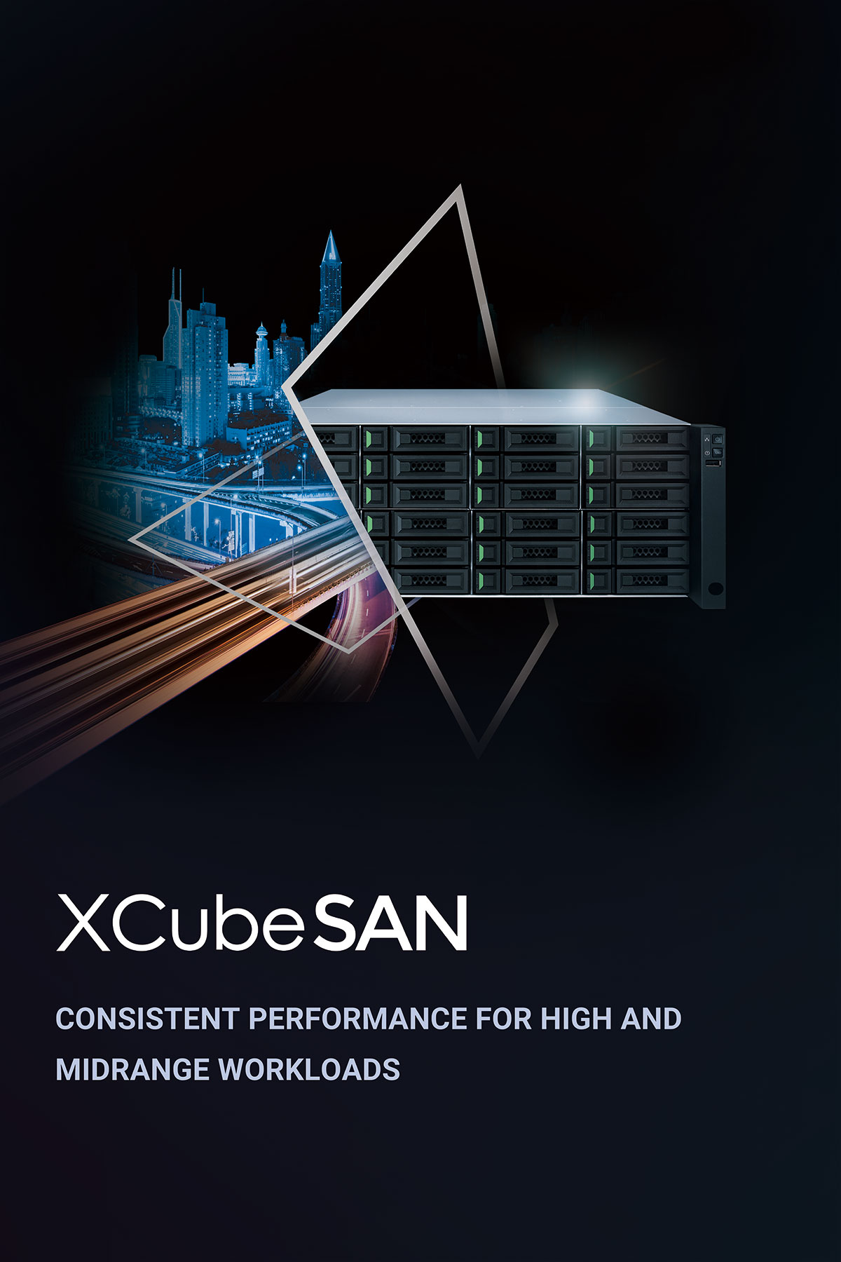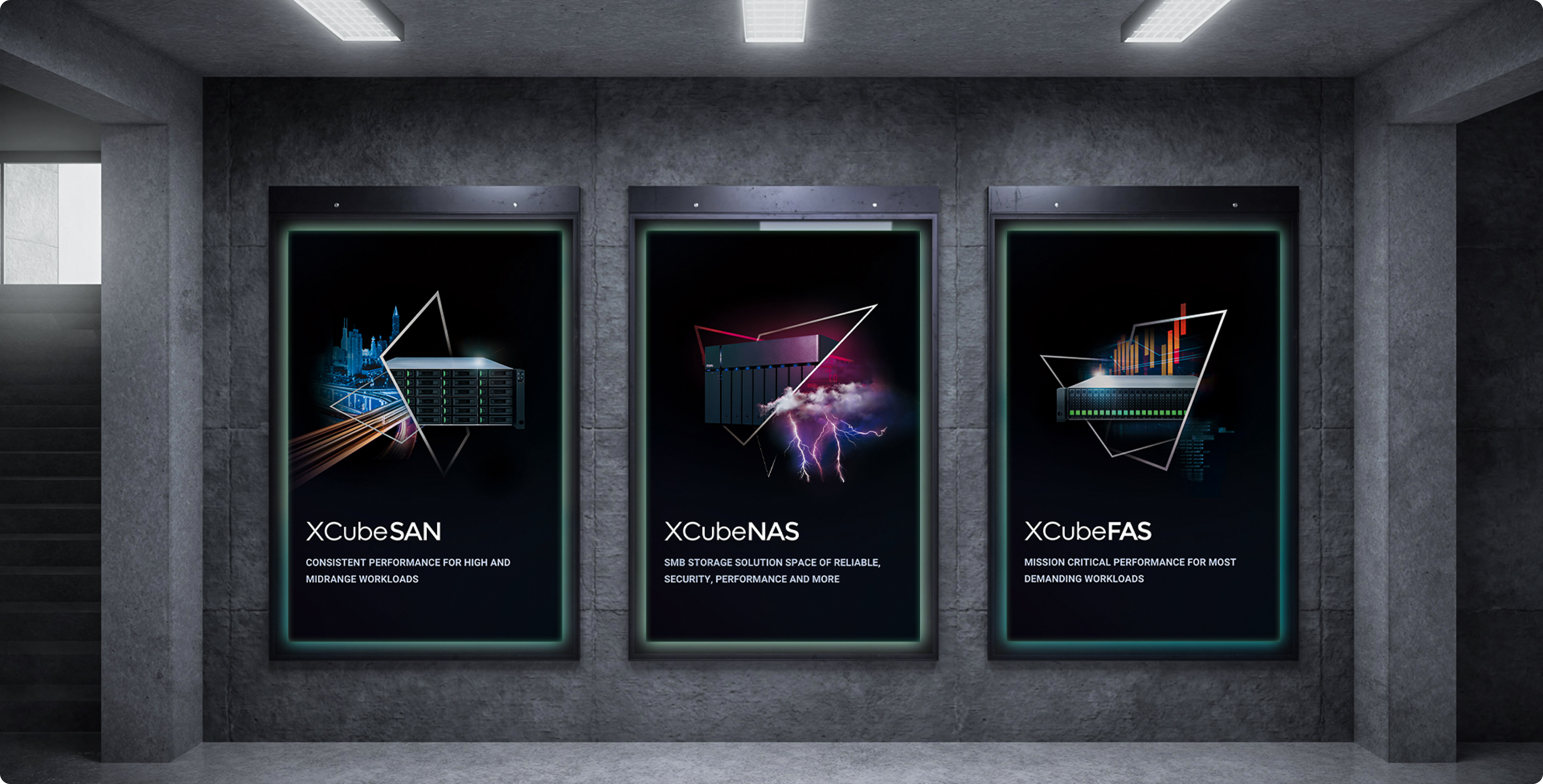 此產品線為「企業級儲存管理系統」,因此行銷策略多針對企業決策者。「安全、快速、穩定、易擴充」為其產品特性,因此以都市作為背景、並加上速度感的線條作為裝飾。